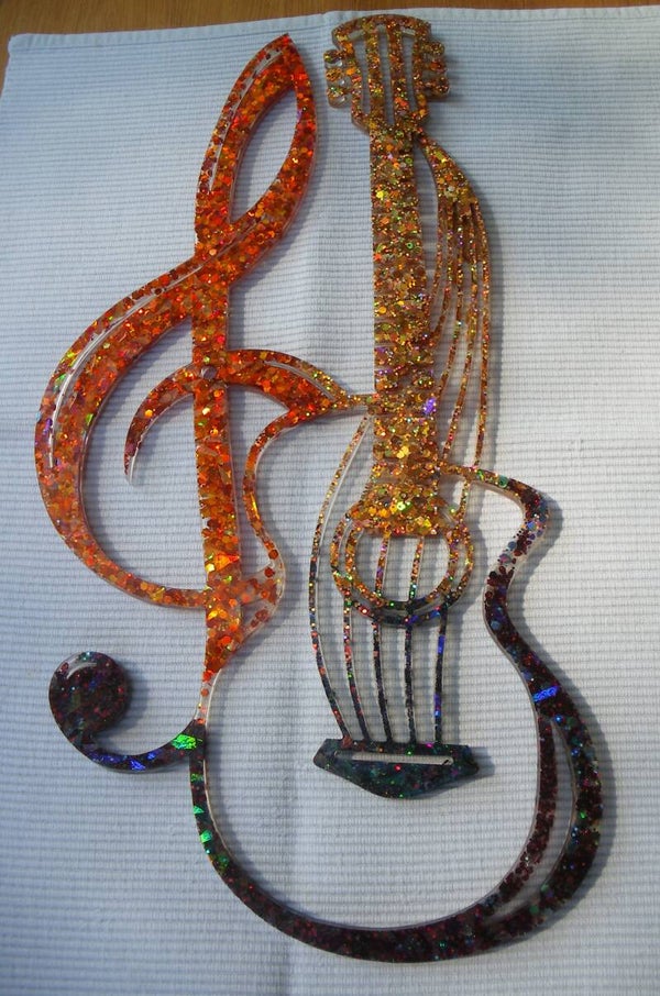 Violon et clé de sol en résine époxy vert, argenté et noir